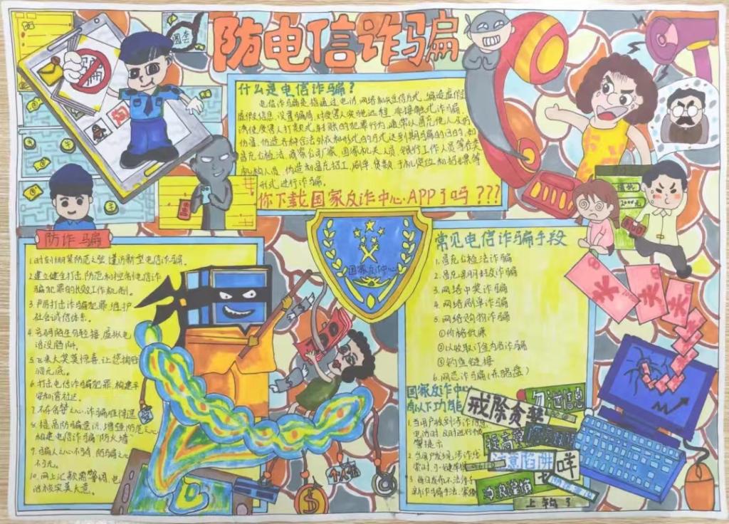 宣传增强防范之心,画纸营造反诈氛围。教育学院于10月上旬开展“反电诈,防电诈”手抄报活动,我院青年学子积极响应,纷纷投稿,共收到近300件作品。通过团总支微信公众号投票、评委老师打分等多轮选拔,共遴选出18份获奖作品,其中一等奖3名,二等奖5名,三等奖10名。21级学前教育1班华蕾蕾的作品以国家反诈中心标志为原型制作手抄报进行知识宣传,呼吁同学们要做到人人下载安装国家反诈中心APP。22级汉语言文学4班刘嘉诚的作品则通过顺口溜和标语告诫大家要时刻紧绷防范之弦,形式新颖有趣。同学们围绕反电诈、防电诈等相关知识,以独特的视角创作出生动形象、寓意深刻的反电诈手抄报,生动再现了网络诈骗层出不穷的手段及应对方法,有力的唤醒了全院师生反诈骗意识。