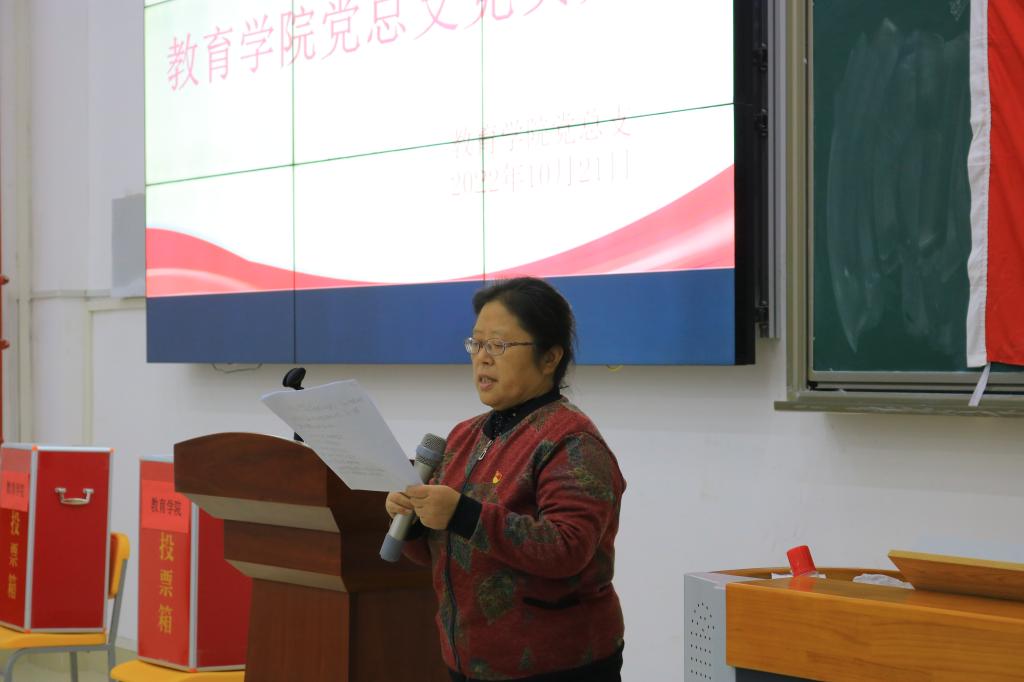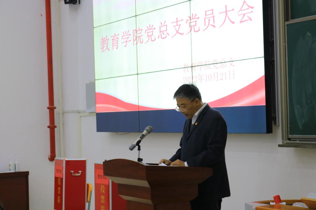 大会在庄严雄壮的《国歌》中拉开帷幕,王家云同志代表学院党总支作了题为《直面现实 笃行不怠 努力实现教育学院平稳持续高质量发展》的工作报告。报告回顾和总结了学院成立一年多以来在党的政治思想和组织建设、教学科研、学生管理等方面取得的成果。报告要求广大党员深入学习习近平新时代中国特色社会主义思想,牢记“为党育人、为国育才”使命,落实立德树人根本任务,坚持“围绕中心抓党建,抓好党建促发展”,不懈怠、不畏难,脚踏实地,奋力推进学院高质量发展。