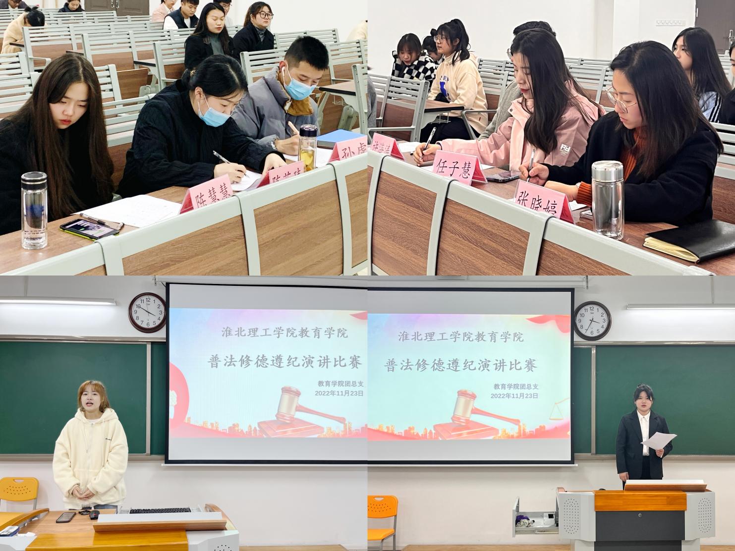 为加深同学们对于普法活动的深刻理解,创新宣传教育方式,教育学院在2号教学楼开展了以“普法、修德、遵纪、创建文明校园”为主题的演讲比赛。由各班级推选一名同学参加院级比赛。同学们积极参与,结合自身经历与时代精神,抒发心中之热血,从不同角度用铿锵的语言表达自己独到的思想。昂扬向上的《践行守法使命,谱写青春华章》,宏观大气的《青年共学法,法治强中华》,微观细腻的《做遵纪守法的好青年》,“走新”又“走心”。同学们纷纷表示通过本次活动加深了自己对宪法的理解,感受到学习宪法所带来的爱国情怀和民族自豪感,并承诺一定会成为法律的严格遵守者和坚定捍卫者。经评选,朱灿灿、黄丹妮等5人获得一等奖,张昊天、谢文蓉等10人获得二等奖,王茹、杨梦雅等15人获得三等奖。相信所有同学也将会立足当下,面向社会,让社会主义法治精神深入人心!