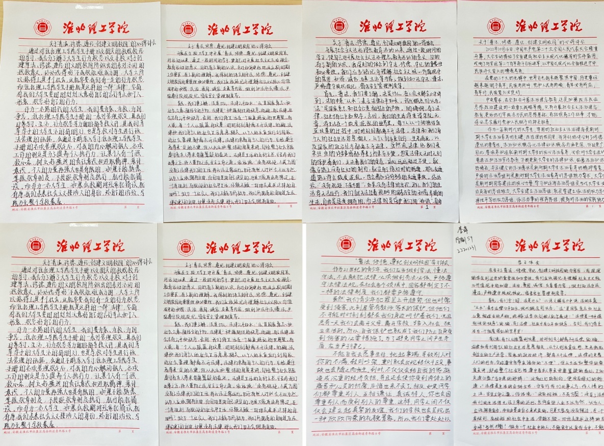 为树立当代大学生知礼守法,讲文明树新风的青春风貌,10月下旬,教育学院要求全体学生认真手写一份不少于1000字的心得体会,并就主题做出承诺书。同学们用肃穆的文字,庄重的承诺,表示定会将法治精神落实到日常事务之中,活动成效显著。