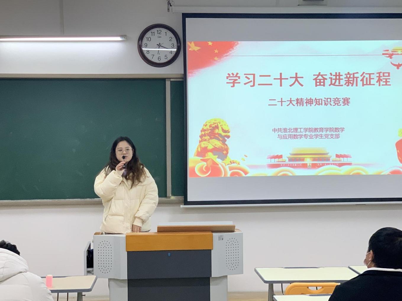 为深入学习宣传贯彻党的二十大精神,回顾党的光辉历史,推动党的二十大精神落地生根、入脑入心。教育学院数学与应用数学学生党支部积极部署,于12月1日在1教313开展“学习党的二十大精神知识竞赛活动”,活动由支部委员孙虎主持,支部书记陈媛媛、全体支部党员及入党积极分子参加了活动。