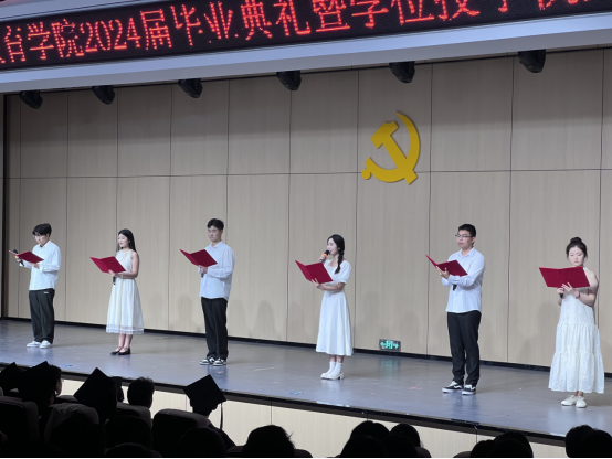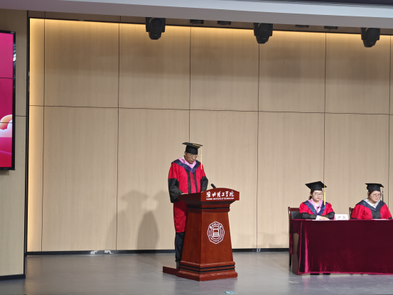 毕业典礼在雄壮的国歌声中拉开帷幕,副院长谢贤德宣读了《开云kaiyun官方网站2024届本科毕业生学士学位授予决定》后,出席仪式的领导和教研室主任分别为毕业生代表颁发学历、学位证书,并进行拨穗正冠与合影留念。