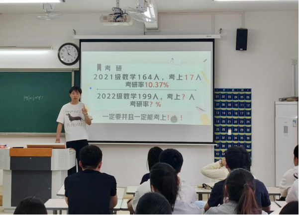 为传承优秀学风,激励学子精准规划职业发展路径,教育学院数学专业于5月26日、27日在1号教学楼召开2026届毕业生“考研、征兵动员大会”。会议以“榜样引领方向,奋斗书写青春”为主线,通过总结2025届毕业生升学入伍的出色成绩,为2026届学生锚定目标、明晰方向。全体2026届数学专业毕业生参会,此次会议由数学专业辅导员郭鸿鑫、吴天一分场主持。