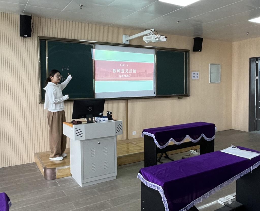 在教案方面,她首先指出问题主要集中在授课时间的填写上,授课时间应按照学校要求将每个教学班的时间都写上;其次,将教案填写的其它要求又给大家重申了一下,包括模板、授课顺次、作业及后记等;最后,强调了教案的归档要求,包括封皮、说明页、课程页和正文,并要求大家会后把封皮信息填写完整。