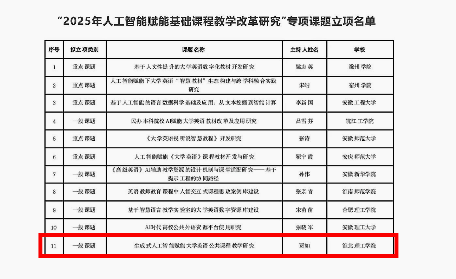 在安徽省“2025年人工智能赋能基础课程教学改革研究”专项课题申报活动中,教育学院青年教师贾如主持的《生成式人工智能赋能大学英语公共课程教学研究》成功获批立项。
