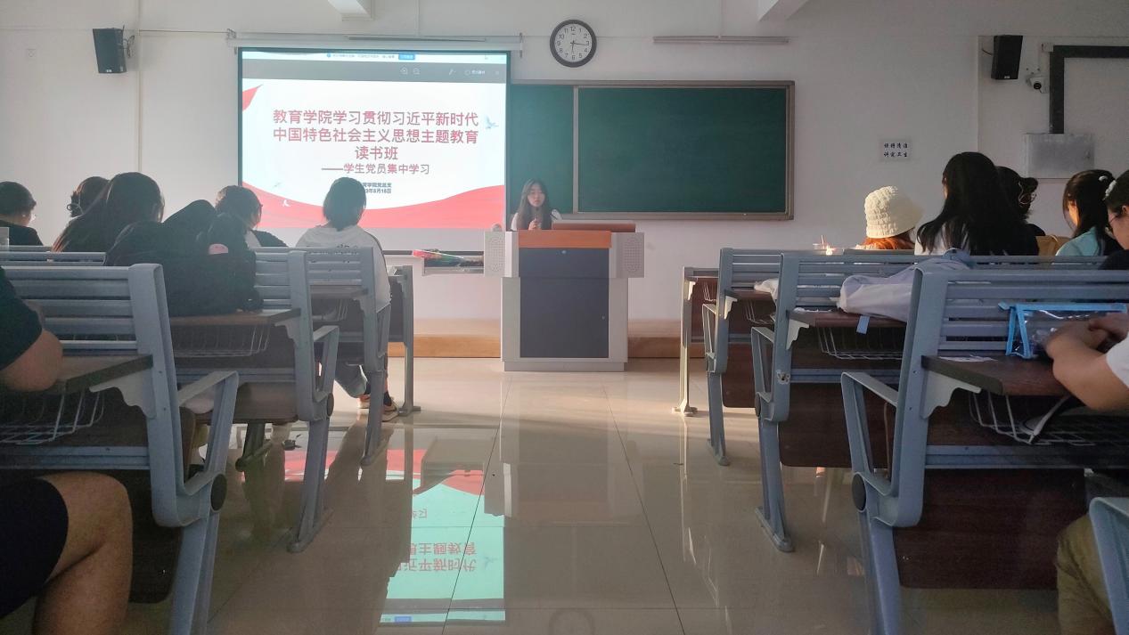 5月15日下午,教育学院在1教420教室开展学习贯彻习近平新时代中国特色社会主义思想主题教育读书班——学生党员集中学习活动。活动由学院组织员陈慧慧同志主持,各学生党支部书记、学生党员和52名发展对象参加学习活动。