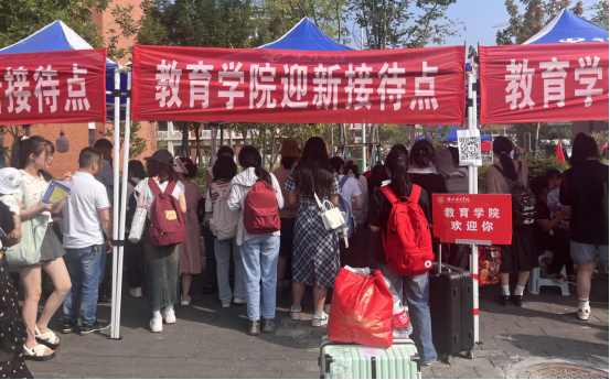 (从车站至校门口到报到处,再到宿舍内,随处可见教育学院迎新老师和志愿者们的身影。宿舍楼下的引导小组按楼层仔细对应核算分发门卡;负责秩序引导、方向指引的小组耐心解答新生的各种问题并介绍校园概况和注意事项;负责行李搬运的小组主动帮忙为新生和家长分担行李。)