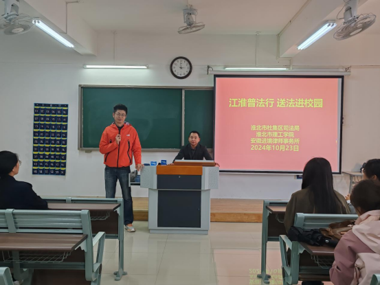 为不断深化普法教育,增强学生们的法律意识和自我保护能力,推动建成和谐、安全的校园环境。10月23日下午,教育学院和淮北市杜集区司法局、安徽进境律师事务所携手于1教421开展“江淮普法行·送法进校园”主题活动。本次活动由教育学院教工第二党支部书记刘畅主持,安徽进境律师事务所合伙人孟春江律师主讲,杜集区司法局普法办主任张丽丽,司法局人民参与和促进法治办主任周立业,杜集区法律援助中心主任赵义玉参与。